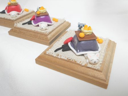 「山盛りみかんかご」「ネコゆきだるま」「桃まんじゅう」