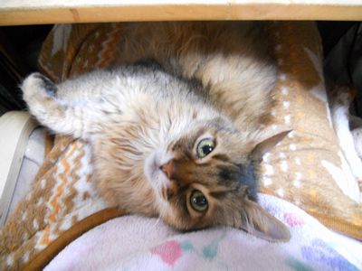 「葉月しゃんの膝の上ですにゃ。あったかいのですにゃ~」