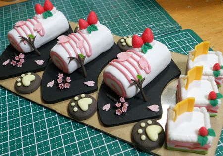 ↑ロールケーキと3色ケーキ、ストラップになる肉球クッキー(チョコ)。