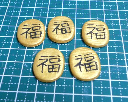 字はフリーハンド、小判はコスモス粘土に金色塗料で筆塗りしてます。
