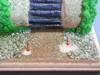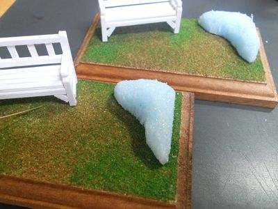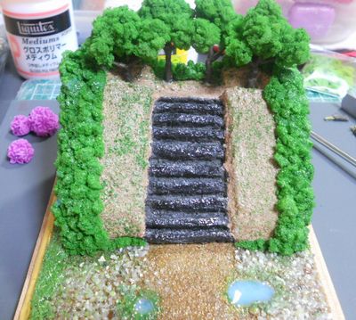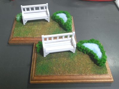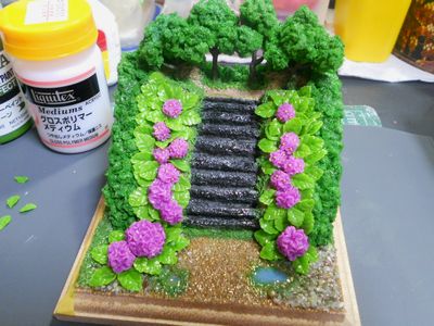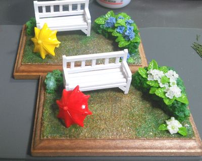 ベンチを接着してその後ろにもラウンドスポンジで植え込みを作ります。