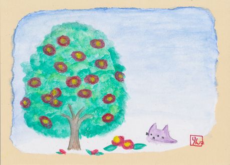 「大きくてまんまるい真っ赤なお花がいっぱい咲いてるにゃ。」
