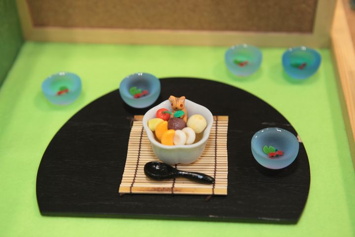 のれん(?)とりんご飴やらとうもろこしを置いたので