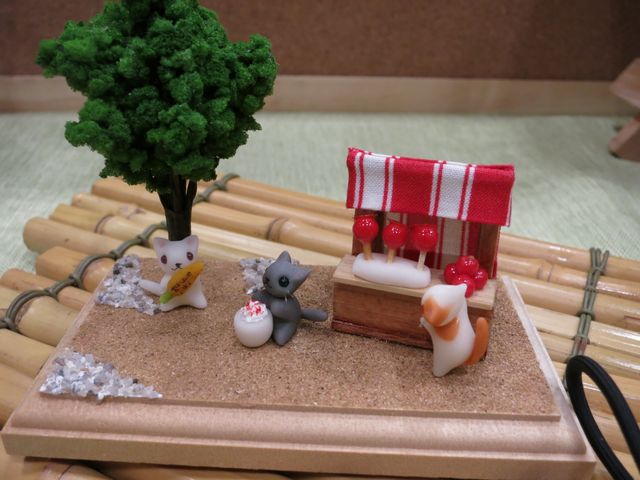 のれん(?)とりんご飴やらとうもろこしを置いたので
